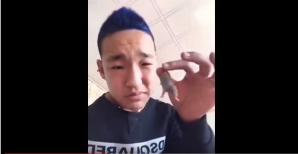 华裔男子准备生吃老鼠令人作恶。(图片撷取自YouTube)