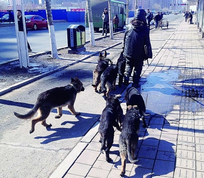 中国吉林网讯(记者王海涛/报道赵毅亮/摄) 带着一群大狗,沿着长春市吉林大路阔步前行……3月11日中午,一头戴棉帽子的男子在巿区内遛狗很是“抢眼”。