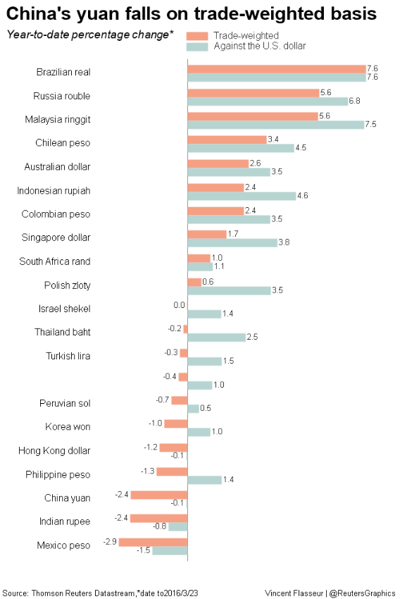 2016年新兴货币普遍走强,且自1月底以来加速升值,因为美国升息速度将比先前预期来得慢的情势愈发明显,这抑制了美元升势。2016年人民币兑美元持平。