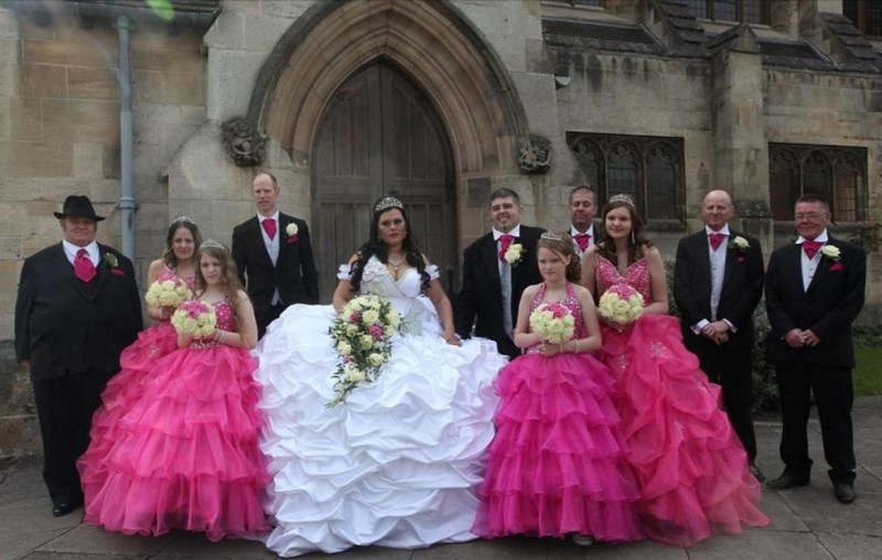 据英国每日邮报,上周六,一对来自英国考文垂的夫妇举办了一场非常盛大的吉普赛婚礼,吸引了网民眼球。这场婚礼的最特别之处在于浓浓的吉普赛风情和新娘身上一套自重63千克的婚纱。这套婚纱体积庞大,样式繁复,以白色锦缎和八个金属质地钢圈制成,其重量甚至比新娘还要重6千克。此外,为了迎合婚礼“班尔希尼秀”的主题,新郎新娘还特意定制了两个大型婚礼蛋糕,并雇佣了一位侏儒巡场表演以调节气氛。