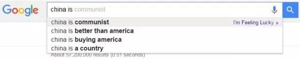 如果搜“国家名+是”(country name + is),会有什么结果呢?我随手一试,发现亮点很多,比如China + is,谷歌就提供了“中国是共产主义的”、“中国比美国(专题)好”、“中国在收购美国”以及“中国是个国家”四种补充选项。