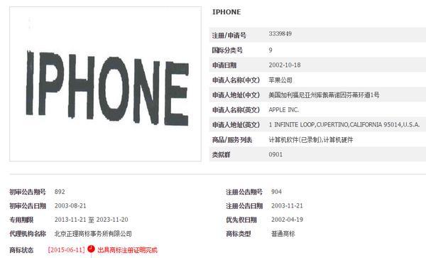 2002年10月18日,苹果公司向商标局申请注册第3339849号“IPHONE”商标,核准日期为2013年11月21日,核定使用在国际分类第9类计算机硬件,计算机软件(已录制)等商品上。