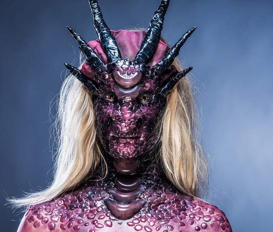受《奇幻森林》的启发,罗桑德将自己变成了一头大象(左);她的恐怖拉链妆(右)