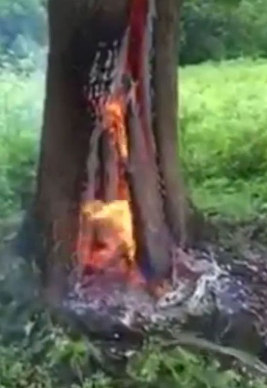 前不久,美国阿肯色州有一棵大树在被闪电击中后,竟然从树干内部燃起熊熊大火!并且,一直可以听到树干中有噼里啪啦的断裂声。