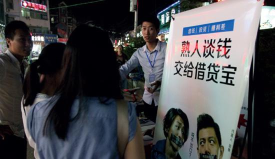 2016年6月5日,湖北武汉,武汉某高校旁有人向大学生促销借贷宝。