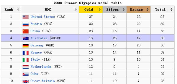 澳大利亚在2000年悉尼奥运会上,得到16枚金牌58枚奖牌,在4年后的雅典,金牌数竟然还要多1枚。
