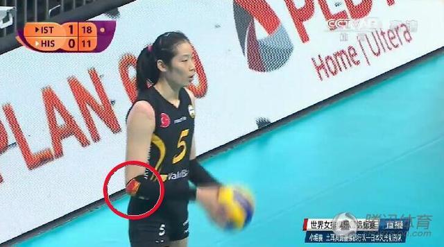 朱婷在赛场表现勇猛,双手护臂上的国旗非常抢眼。