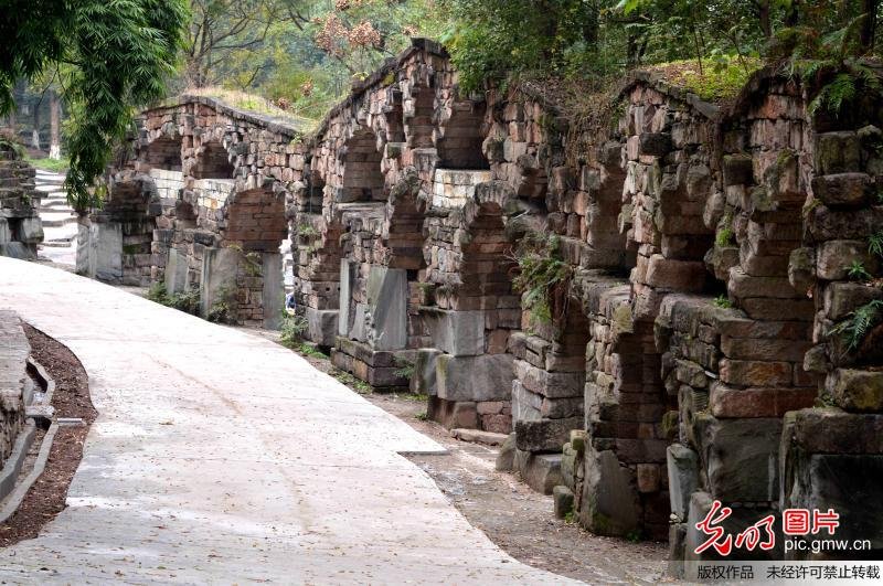 2016年12月2日,重庆,四川美术学院虎溪校区,由一座由砖头、石板和碎瓦片堆积而成的"古堡城校门"。(刘向龙摄/光明图片)
