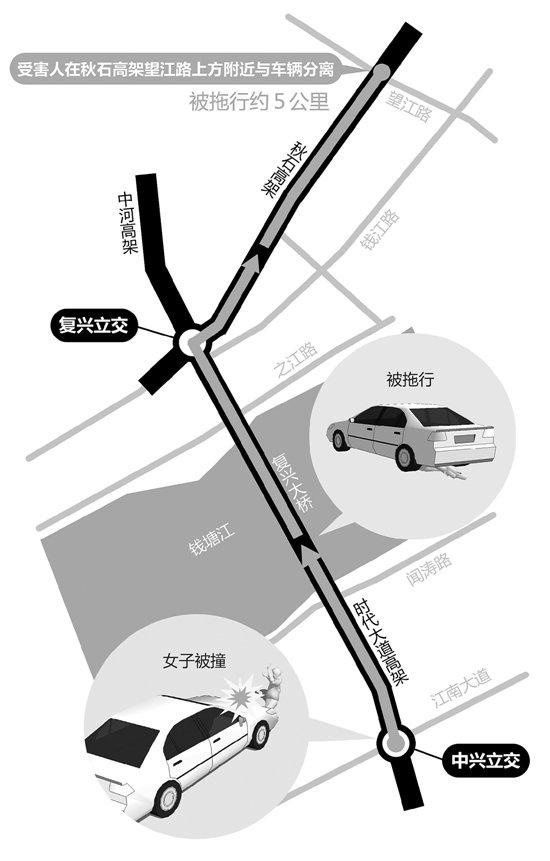 仔细分析警方通报会发现,女子在中兴立交附近被撞,拖行到秋石高架望江路上方最后才跟车子分离。钱江晚报记者测过,这段距离长达5公里多。在这么长的距离中,撞了人又拖行,肇事司机到底有没有感觉?