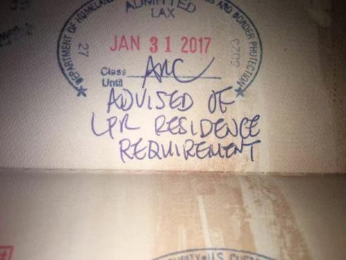 移民律师马强表示,目前华人游客出入境通常不会有大问题。不过移民官在特朗普移民政策出台后有点“打了鸡血”却是事实。他的一位客户过年回国探亲一个月,1月31日在持绿卡返美于洛杉矶(专题)国际机场入境时,被告诫在境外长时居留,就要取消绿卡,且在其入境章下写上“已告知居留要求”字样。