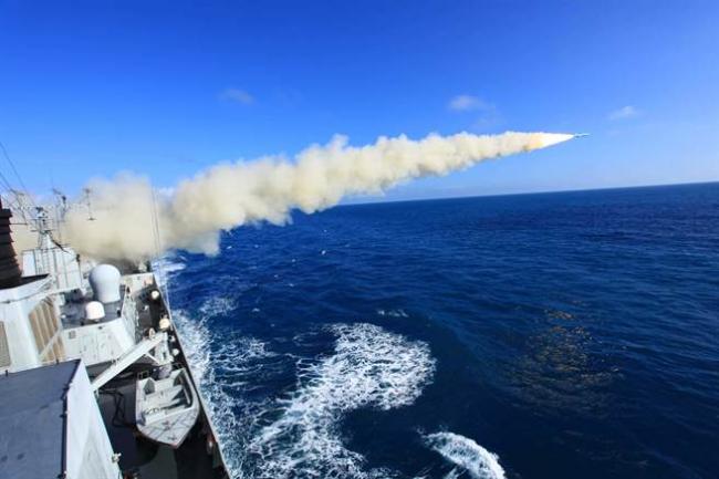 中国导弹驱逐舰海口舰。 包括海口舰在内的中国南海(专题)舰队2月10日下午驶离三亚,将展开远海训练,图为"海口舰"发射反舰导弹的资料照。(图/中新社)
