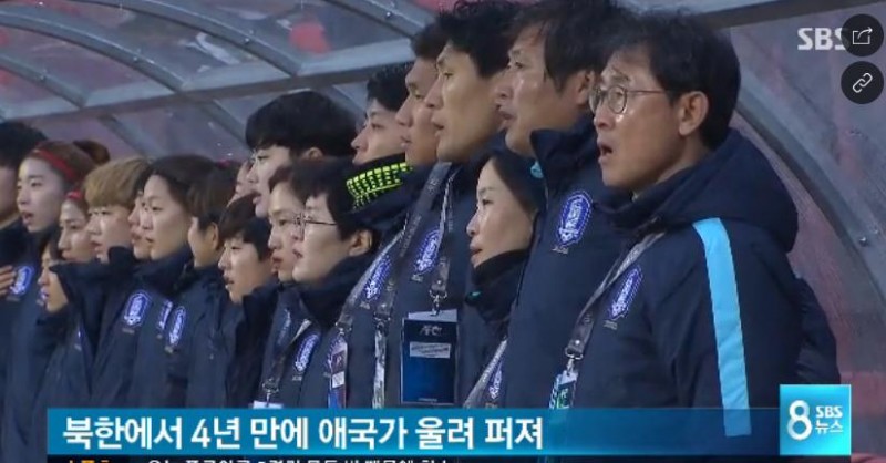 金日成体育场5日首次升起韩国国旗,韩国女国脚们还在赛前唱国歌。