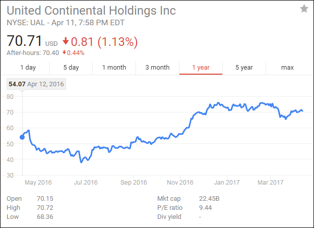 在暴力发生之后,一部分的投资者的确是被影响到了,股价在昨天最低时还是下跌了2.5%。但是随后,另外一部分投资者选择在低位吃进市场上的股票。他们认为,总体经济形势向好,航空业也处于复苏之中。很多投资者都对于美联航的未来看好,在过去的一年之内,美联航的股价已经上升了33%。