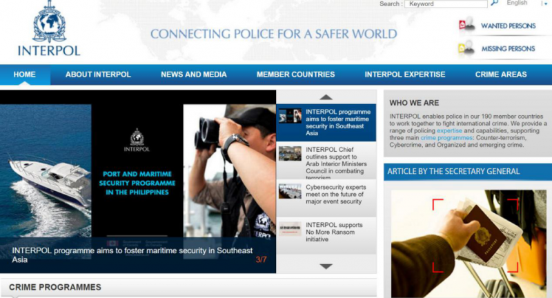 国际刑警组织总部位于法国里昂,官方语言有英、法、西以及阿拉伯语四种 打开国际刑警组织官方网站首页,即可看到右上角显眼位置有两个红色和黄色的小标识,位列第一的,配有红色国际刑警警徽的“WANTED PERSONS”标识,即该组织最为著名的国际通报——红色通缉令。