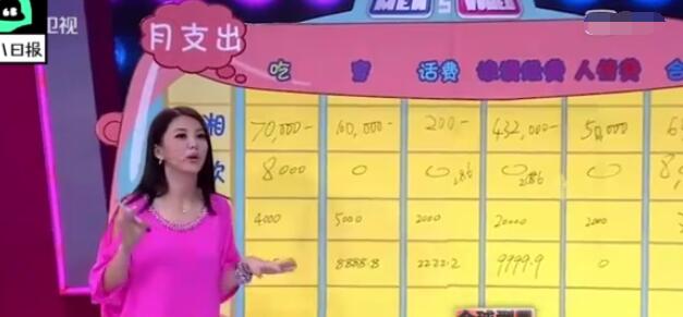 其实,李湘的大手笔开支还不止这些,在某综艺节目上,李湘自曝自己一个月的开支是60多万。而这样的开支,相比在场的女嘉宾蒋欣,更是她的80被之多。张宇给李湘算了一笔账,李湘一个月在吃上的开销是7万元左右,而穿衣方面则是10万,对此,李湘则说大部分的衣服都是赞助商提供的,所以这方面开支是小的。