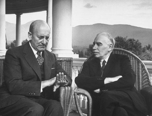 1944年,约翰·梅纳德·凯恩斯(右)与财政部长小亨利·摩根索在新罕布什尔布雷顿森林的一次国际货币会议上交谈。