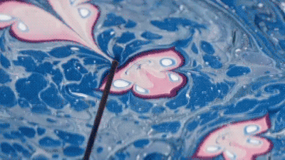 这种工艺有个英文名,marble 译为‘大理石纹理’。 在14世纪传入土耳其后, 又有了新名字湿拓画Ebru, 有“浮水染色技法”之意。