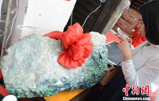 福州首届玉文化“赌石”大会上,重达380公斤翡翠玉王惊艳全场。 记者刘可耕摄