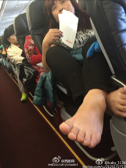 【乘飞机#大妈脱鞋脚搭前排扶手#】@baby_1124 爆料:乘坐曼谷飞往西安的航班,后座的大妈不但将鞋子彻底脱掉,还肆无忌惮将双脚完全搭在了前排乘客的扶手上。这一举动持续了数小时的航程!呼唤空姐制止这种行为,空姐说她们对此感到无奈但无法制止…估计亚洲航空被泼泡面的中国人吓怕了。