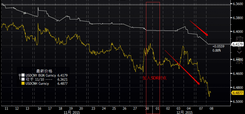 在岸人民币五年来走势(白色:在岸价;黄色:离岸价)