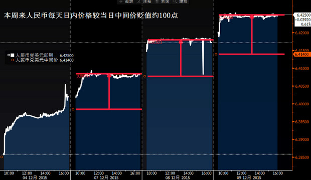 本周来人民币每天日内价格较当日中间价贬值约100基点