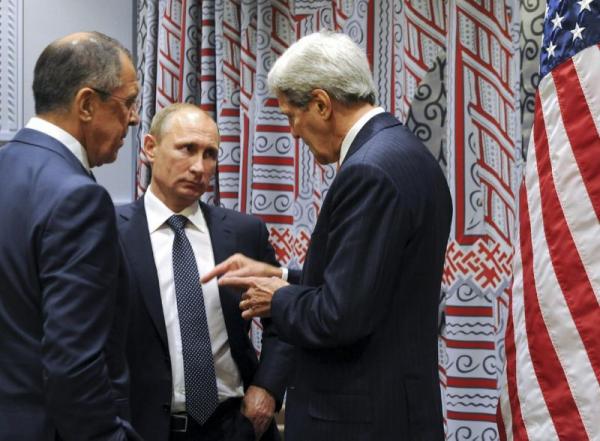俄外长拉夫罗夫(左)、普京与克里在克里姆林宫就叙利亚问题会谈
