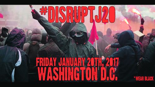 抗议组织DisruptJ20 发布的活动广告。 网络图片 【侨报编译巴斯闻1 月18 日报道】因为川普当选而感到愤怒的抗议者组成临时组织,他们的领导者周三承诺,会在川普就职日搞些破坏活动,阻止人们进入观礼现场。