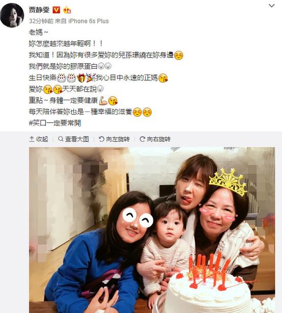 1月16日报道 1月16日凌晨,贾静雯在微博晒出为妈妈庆生的照片,并写道:“老妈~你怎么越来越年轻啊!!我知道!因为你有很多爱你的儿孙环绕在你身边,我们就是你的胶原蛋白。生日快乐,我心目中永远的正妈,爱你,天天都在说!重点,身体一定要健康!每天陪伴着你也是一种幸福的滋养。”照片中,贾静雯带着两个女儿为妈妈庆生,咘咘又抢镜了。