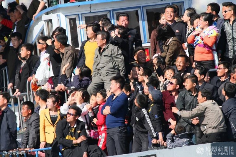 2017年5月5日报道,1日,辽宁丹东,五一国际劳动节期间,朝鲜(专题)新义州市民3000多人身着节日服装,乘船游览鸭绿江,眺望中国丹东。朝鲜民众和岸上的中国民众挥手互送问候。