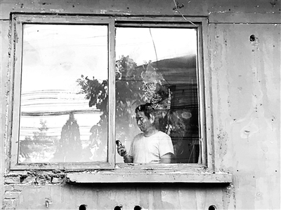 章莹颖(专题)的父亲站在窗口翻着手机,依然没有女儿的消息 摄影/实习记者 张曜麟