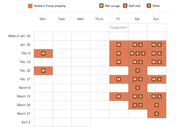 特朗普(专题)给自己的产业做免费广告 在特朗普就职上任的11周里,他有9个周末都是在自己的名下的产业里度过的。据统计,他有22天的时间待在自己的俱乐部或者酒店里。这在美国引发了有关总统职责和私人利益的争议。