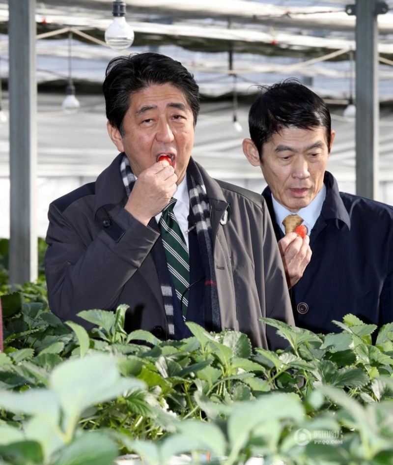 当地时间2016年12月10日,日本福岛,日本首相安倍晋三造访当地一个草莓农场,视察灾后重建情况。视觉中国