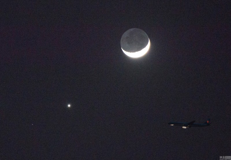 2017年01月02日,广东省深圳市,天宇上演“金星合月”,一架客机起飞时与金星月亮合成美丽景象。
