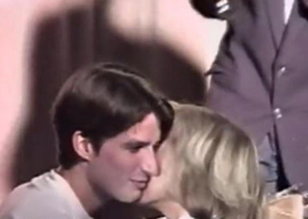 拍于1993年的片段中,马克龙参演话剧,剧终后亲吻走到台上的特罗尼厄。(图片来源:法国媒体)